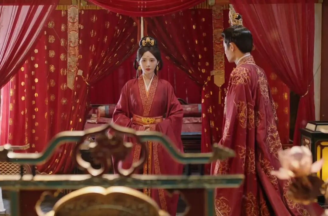 服化道看着还行,彭小苒的红衣绣了点花纹,男主的龙袍也有金线,但一到镜头里就露馅了。