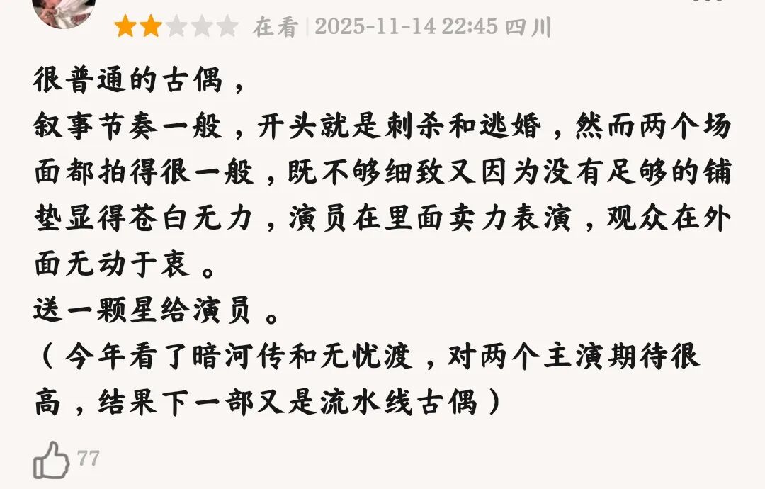 还有配乐更是敷衍,明明是 2024 年拍的剧,制作水平还不如 2011 年的《宫锁心玉》,内娱的制作水平是倒着走的吗?